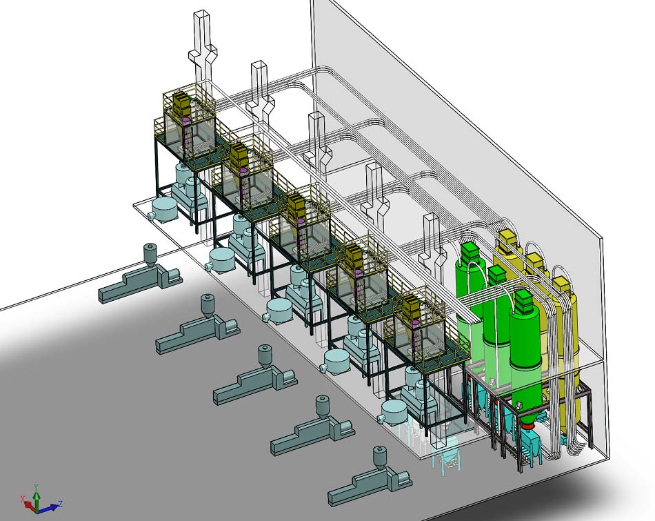 本產(chǎn)品為多種原料配方自動(dòng)計(jì)量磅秤,該上料輔機(jī)系統(tǒng)將原料區(qū)與生產(chǎn)區(qū)分離,采用真空吸引輸送技術(shù),幫助客戶降低設(shè)備及建筑成本,減少人工,并實(shí)現(xiàn)清潔生產(chǎn)。該系統(tǒng)采用中央控制體系,技術(shù)員可于中控箱的操作面板上直接控制、檢查全套設(shè)備的工作情況。